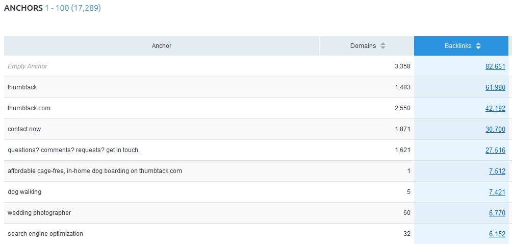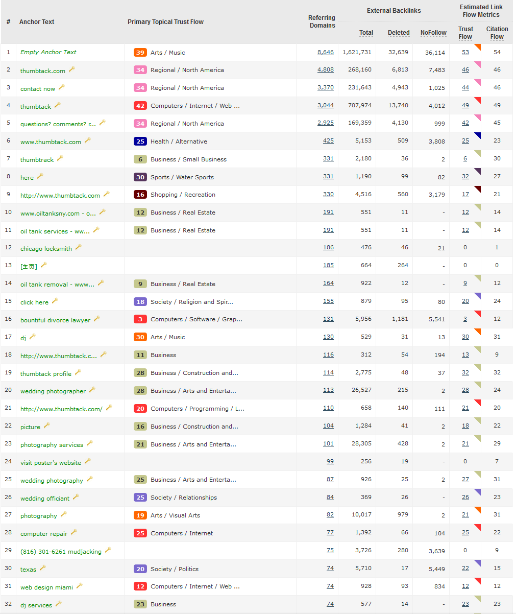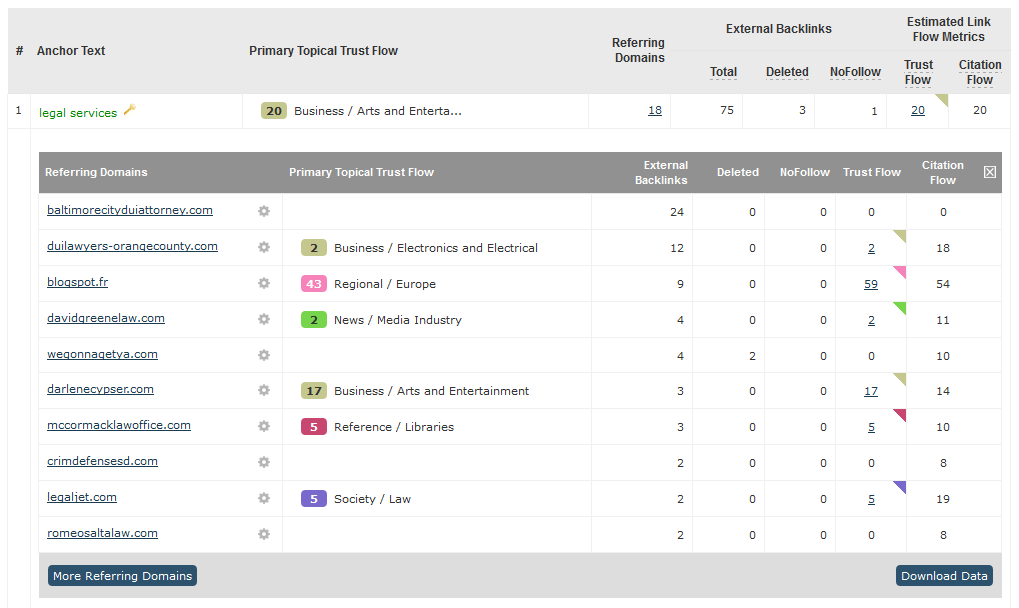 One of the examples in the original article shows up in a variation in Majestic for “legal services.” As you can see, there are 18 referring domains who linked to Thumbtack in this fashion, almost all with extremely low Trust Flow and Citation Flow.