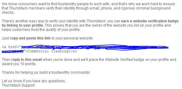 We have a business registered on Thumbtack so we receive their newsletters. I’m aware that review sites offering a “badge” or verification logo which links back to your profile is nothing new. But the email I received from Thumbtack is a fairly blatant attempt to game Google for popular keywords.