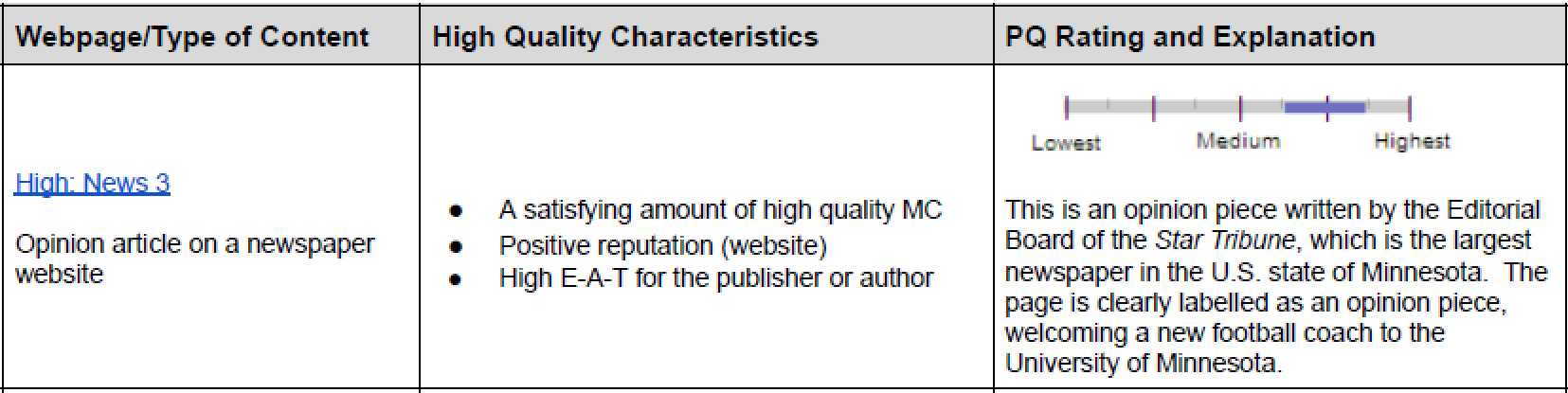 A Wikipedia article on a non YMYL topic ( example ) with a satisfying amount of accurate information and trustworthy external references can usually be rated in the High range. Some Wikipedia articles may even be rated higher, although remember that a high level of expertise is required for YMYL topics. A PQ rating in the Medium range is often appropriate for pages with less extensive MC and external references. Naturally, Wikipedia articles with very little MC should get lower PQ ratings. Factual inaccuracy is a sufficient reason for a Low or Lowest rating.