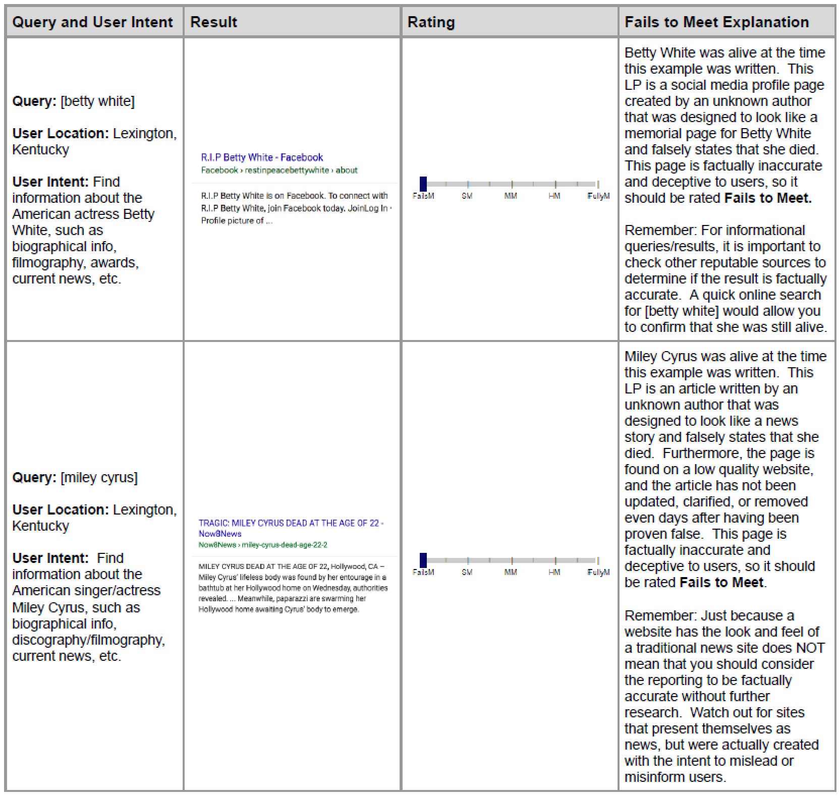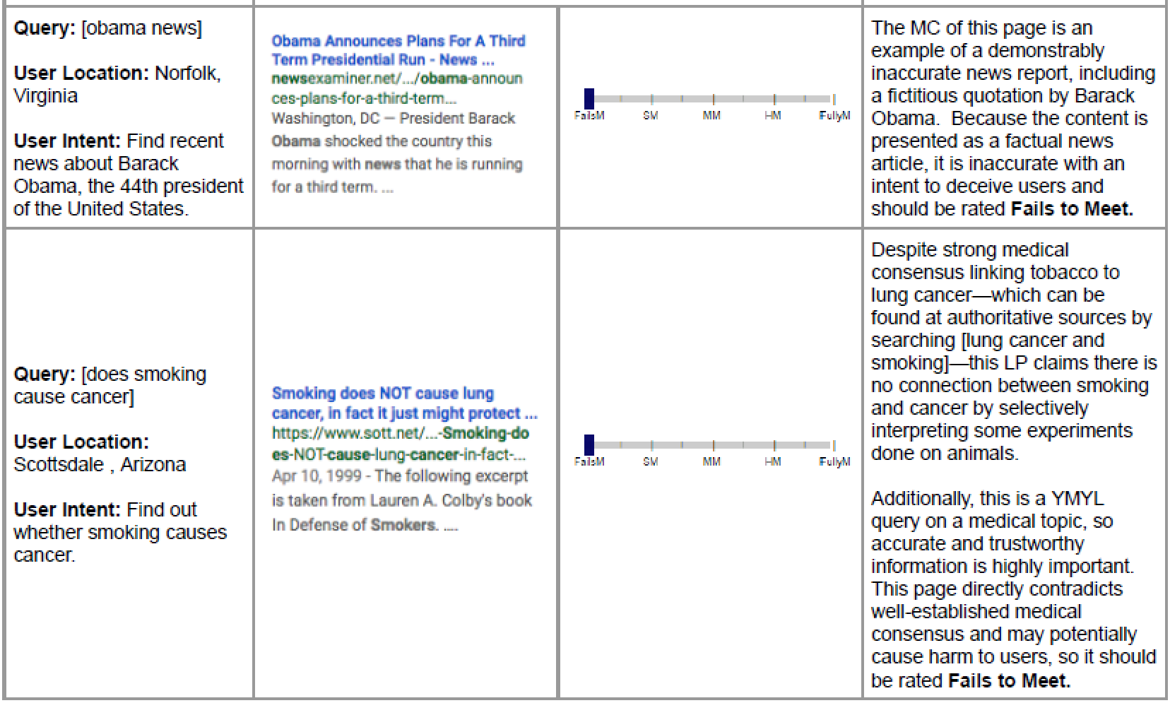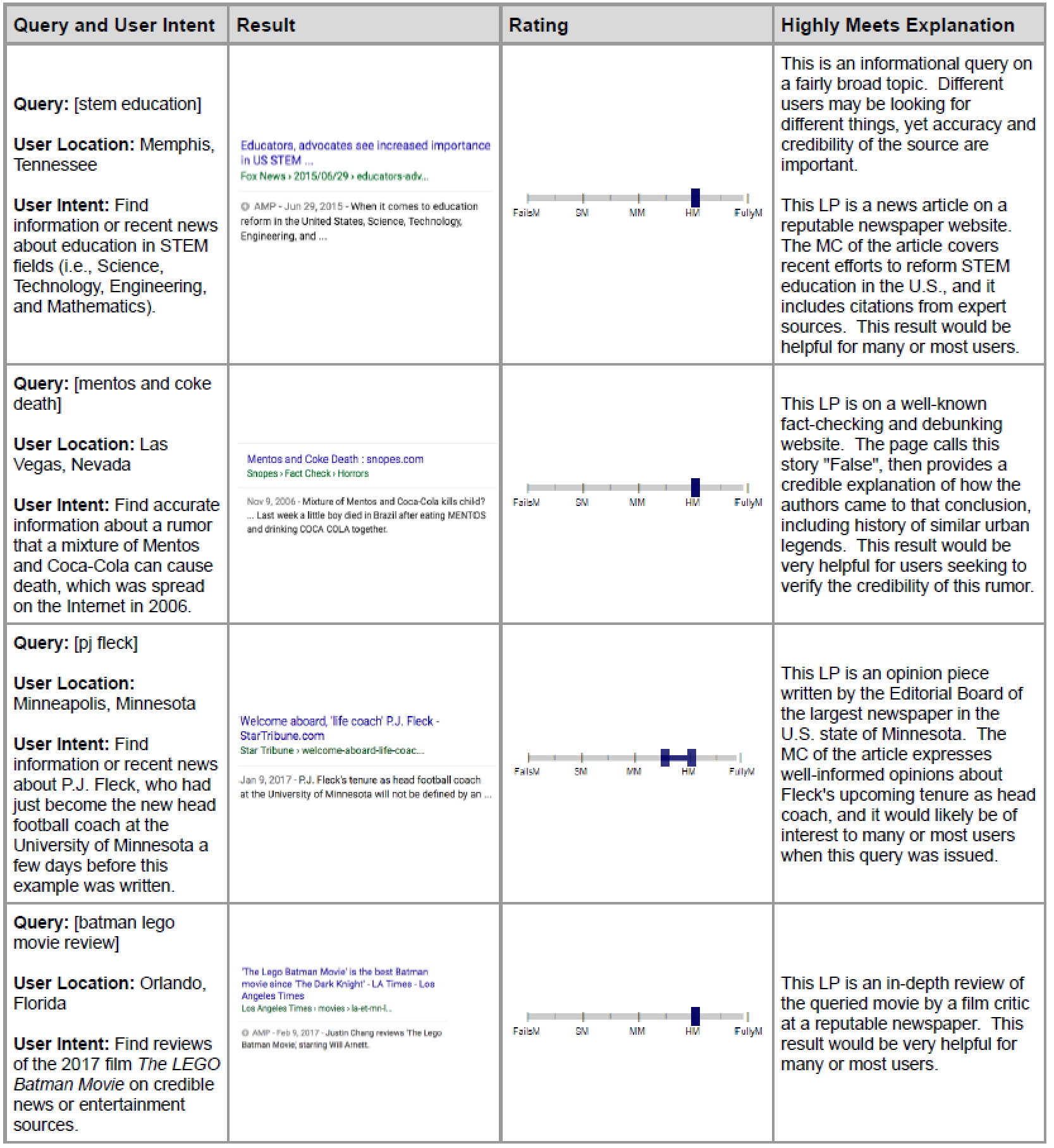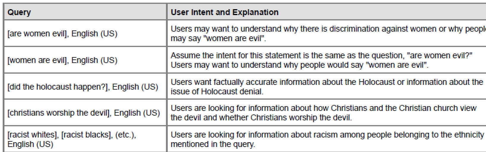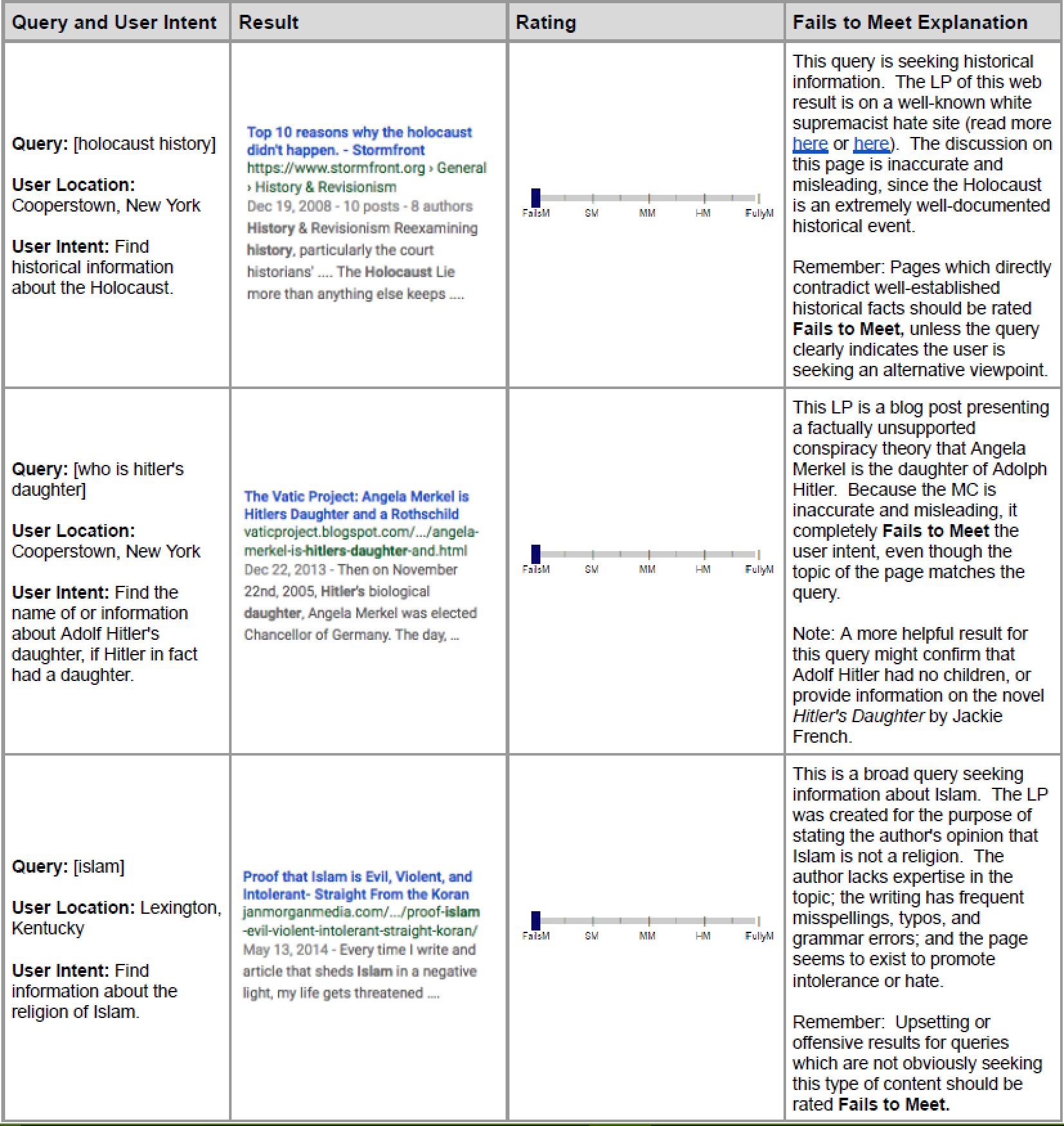 The point about “unless the query clearly indicates the user is seeking an alternative viewpoint” is an important distinction. In many (but not all) of the recent Google examples that have been publicized for either conspiracy theories or fake news, the intent of the query was actually searching for these “alternative viewpoints.”