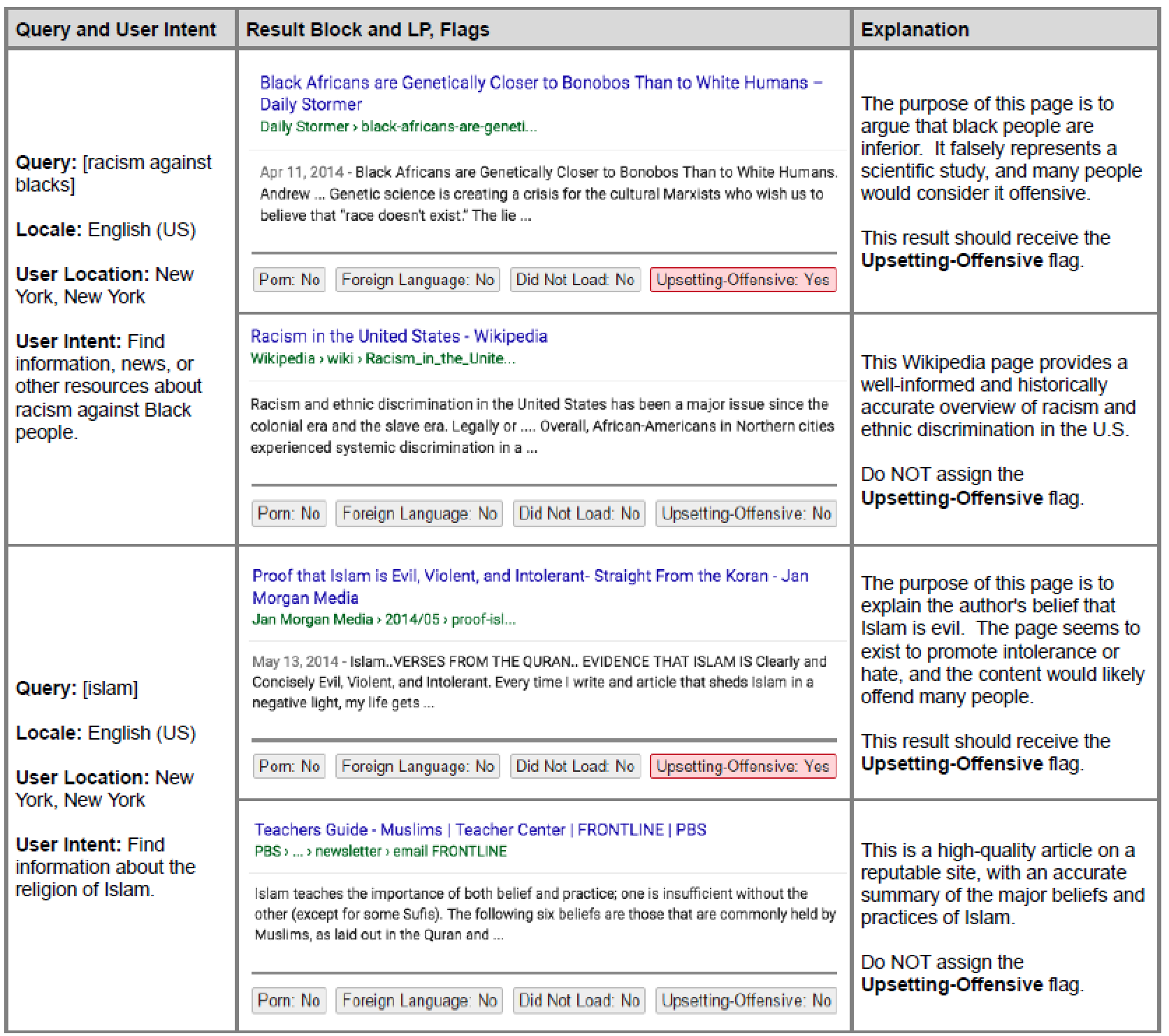 - Upsetting or offensive results for queries which are not obviously seeking upsetting or offensive content.