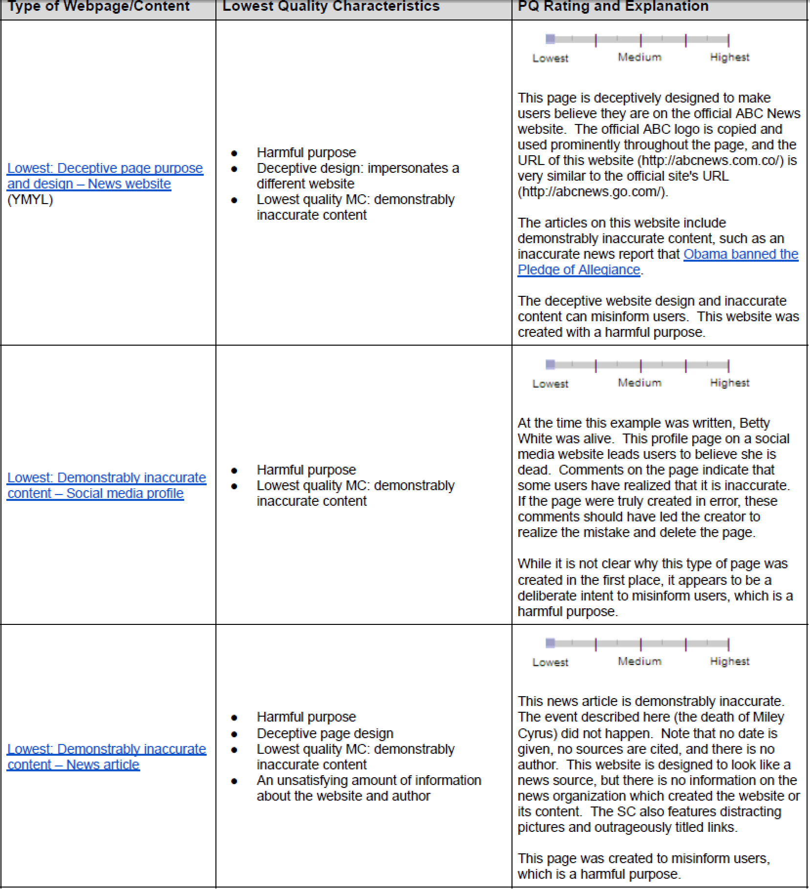 Inaccurate or misleading information presented as fact is also a reason for Low or even Lowest quality ratings.