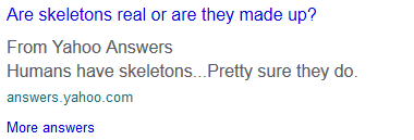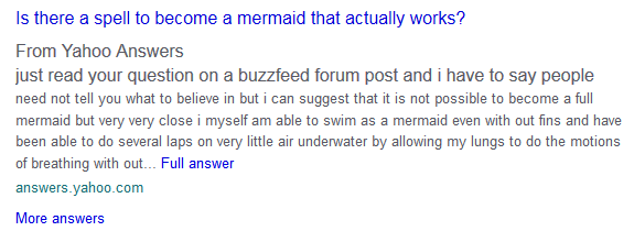 So Yahoo definitely lacks a filter for the type of Yahoo Answers that routinely end up on Imgur showcasing ridiculous questions. But since they pull from both Google and Bing search results, there is easily the opportunity for them to use those featured snippets instead of using the opportunity to drive traffic to Yahoo Answers. However, with how ad-heavy Answers is, it could also be a conscious decision for more ad revenue.