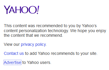 Yahoo is soliciting publishers who would like to have Yahoo’s “content personalization technology” appear on their own sites by emailing yrecommends-learnmore@yahoo-inc.com. They are run on a revenue share basis, where the publisher earns a share of the ad click.
